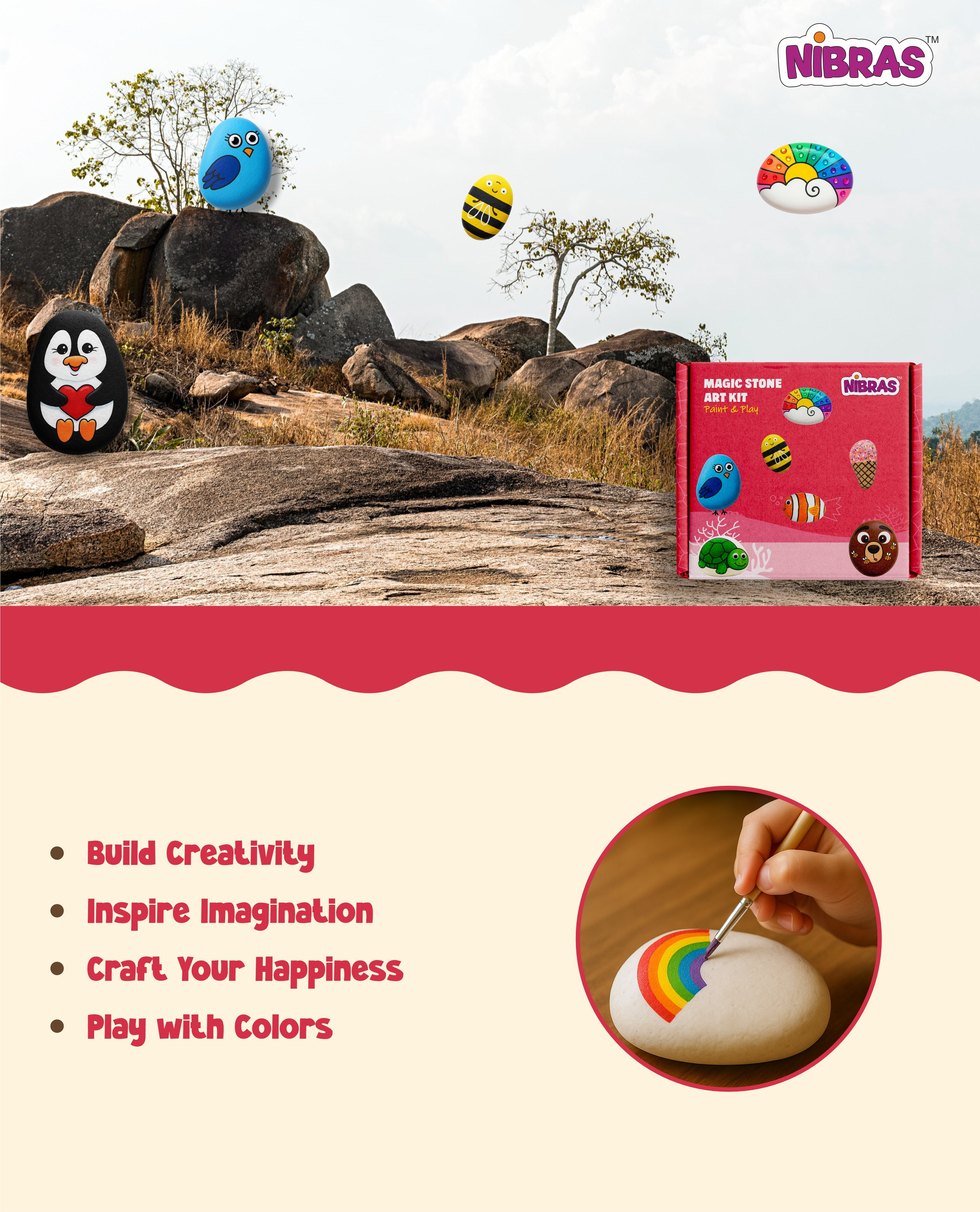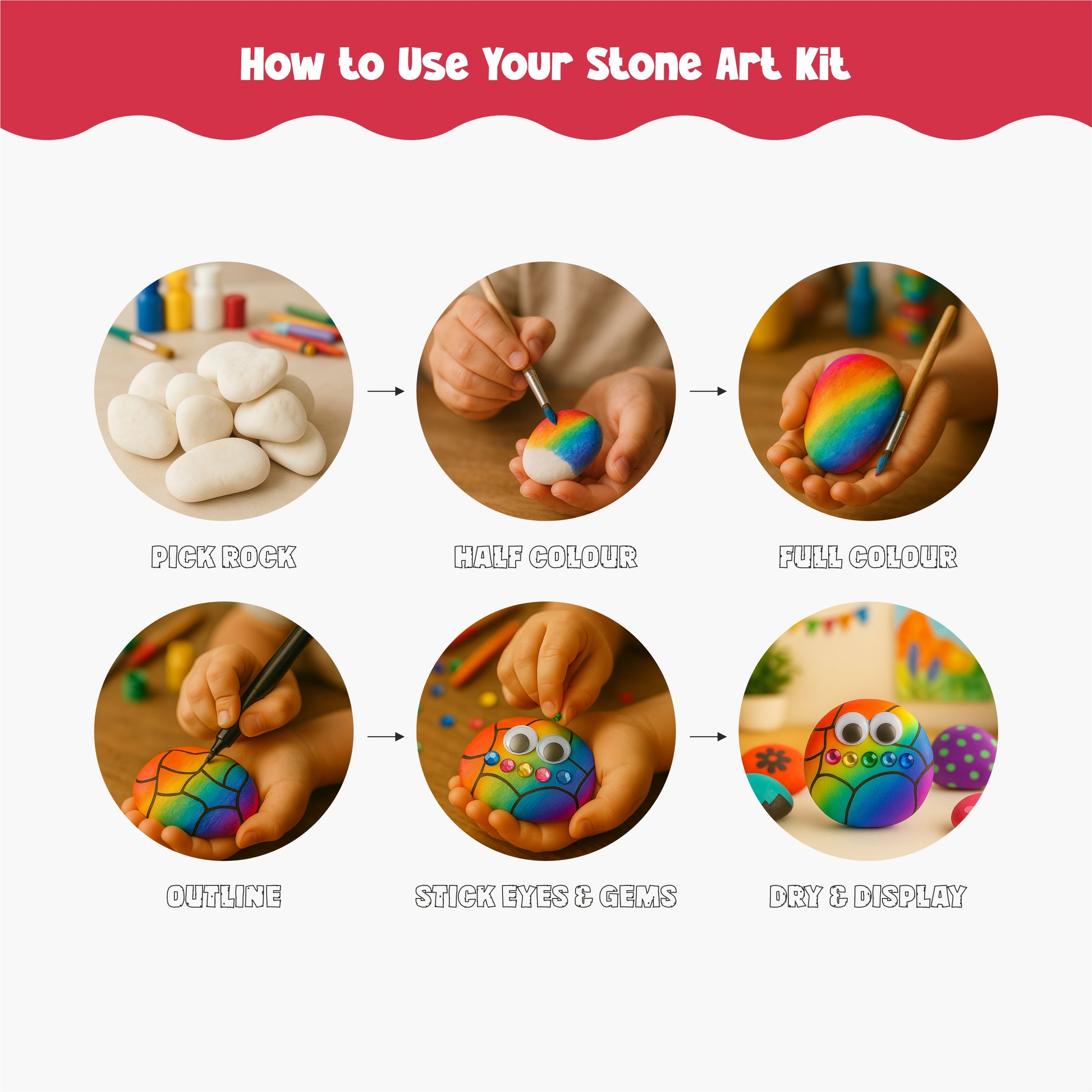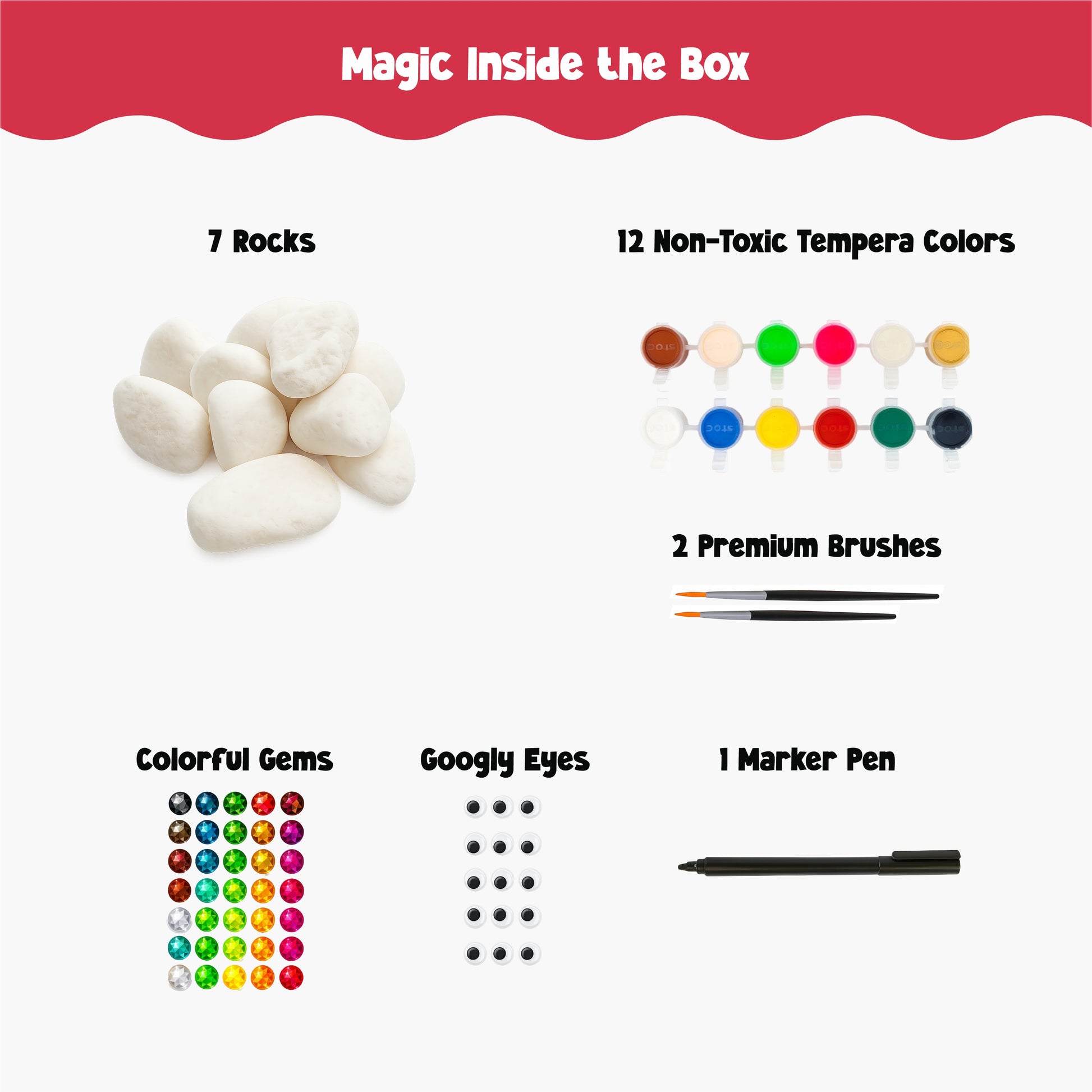What’s Inside the Box: 7 Smooth Painting Stones, 12 Non-Toxic Tempera Colors, 2 Premium Brushes, 1 Marker Pen, Googly Eyes, and Colorful Decorative Gems everything your child needs to create amazing stone art! Spark Creativity & Imagination: Encourage your little artist to explore their creativity through painting and decorating unique stones. Perfect for developing fine motor skills, focus, and artistic confidence. Safe & Non-Toxic Materials: Our paints are child-safe and easy to clean. Stones are smooth and ready to paint, ensuring a fun and worry-free crafting experience for kids. Perfect Gift for Boys & Girls: Ideal for birthdays, return gifts, school projects, or festive presents. A great alternative to screen time that keeps kids happily engaged and learning through art. Fun DIY Activity for All Ages: Whether it's a solo craft or a family art day, this kit brings joy and creativity to every moment.